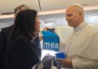 (15:28, 14.04.2026, ZAH, 20260414031, P: 3) Pozornosť médií upútal už počas letu, keď od novinárov prijal symbolické dary od charitatívnej organizácie Mary’s Meals – tričko a typický modrý hrnček. | Pápež Lev XIV. v domove dôchodcov v Annabe: Takže nádej existuje!
