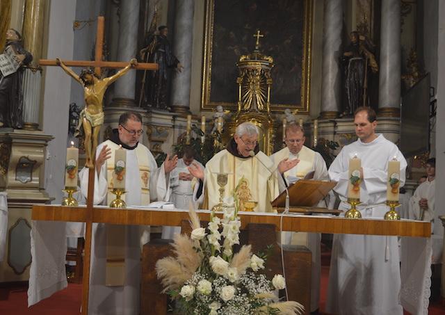 Františkánska komunita v Hlohovci tieto dve jubileá spojila pri slávnostnej svätej omši, ktorú celebroval páter Cyril Jaroslav Brázda OFM, animátor úradu spravodlivosti, pokoja a ochrany stvorenstva, pôsobiaci vo Fiľakove. Koncelebrantmi boli páter Jeremiáš Daniel Kvaka OFM, gvardián a správca kostola, a Dušan Harvilik, farský vikár v Raslaviciach.