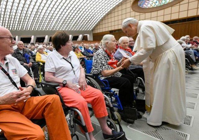 Pápež vysvetlil, prečo sa s nimi stretol ešte pred samotnou audienciou: „Predtým, než sa odoberiem na generálnu audienciu na námestie, chcel som sa s vami osobne stretnúť tu, v Aule Pavla VI. Tu budete mať možnosť sledovať, čo sa deje na Námestí sv. Petra na veľkoplošných obrazovkách, a zároveň budete viac chránení.“