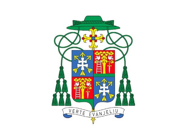 O lipu je heraldicky vpravo opretý strieborný rebrík a vľavo na pažiti sklonený strieborný meč so zlatou rukoväťou. Za štítom stojí zlatý, farebnými kameňmi a perlami zdobený procesiový kríž, prevýšený zeleným kňazským klobúkom so šiestimi zelenými strapcami na zelených šnúrach na každej strane.