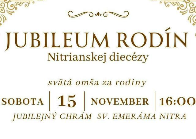 Nitra 30. novembra (TK KBS) V rámci prebiehajúceho Jubilejného roka 2025 Nitrianske biskupstvo pozýva predovšetkým manželov s ich rodinami (deťmi, vnúčatami, pravnúčatami…) na slávenie Jubilea rodín Nitrianskej diecézy, ktoré sa bude konať v sobotu 15. novembra 2025 v Katedrále-Bazilike sv. Emeráma v Nitre, ktorá je aj jedným z jubilejných chrámov Nitrianskej diecézy a možno v nej získať jubilejné odpustky.