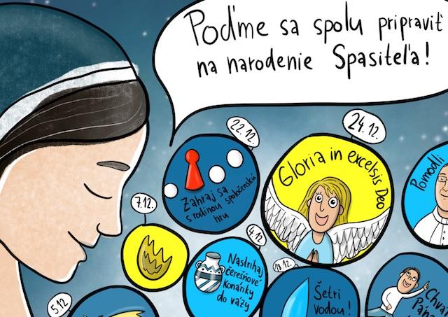Každý deň obsahuje jednoduché úlohy a malé výzvy, ktoré podporujú lásku k druhým, dobročinnosť a uvedomenie si potrieb ľudí okolo seba. Prostredníctvom aktivít sa deti učia modlitbe, obetavosti a citlivosti, pričom čiernobielu verziu si môžu po splnení úlohy vyfarbiť a sledovať tak svoj pokrok hravou formou.