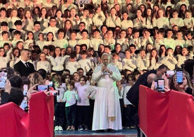 Po speváckom vystúpení detí v školskej telocvični sa spontánnymi slovami prihovoril Svätý Otec. Okrem iného povedal: „Počúvať tieto deti spievať v toľkých jazykoch nám pomáha pochopiť, ako Vianoce prebúdzajú v srdciach nás všetkých radosť, pokoj a skutočne dôležité pozvanie. Veľmi sa teším, ďakujem. (...)