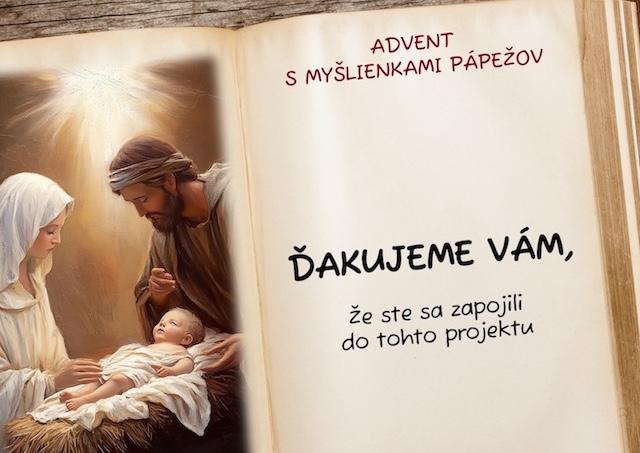 Bratislava 26. decembra (TK KBS) Projekt Advent s KBS, ktorý Konferencia biskupov Slovenska realizovala od Prvej adventnej nedele 30. novembra do Štedrého dňa 24. decembra 2025, sa úspešne zavŕšil. Počas štyroch týždňov prinášal denné myšlienky pápežov k adventnému času, ktoré oslovili tisíce ľudí na Slovensku i v zahraničí a pomohli im hlbšie prežiť prípravu na slávenie Narodenia Pána.
