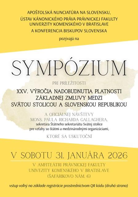 Bratislava 15. januára (TK KBS) V Amfiteátri Právnickej fakulty Univerzity Komenského v Bratislave sa v sobotu 31. januára uskutoční medzinárodné odborné sympózium pri príležitosti 25. výročia nadobudnutia platnosti Základnej zmluvy medzi Slovenskou republikou a Svätou stolicou.