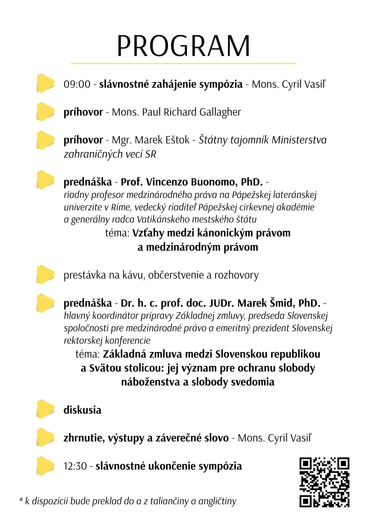 Prof. Vincenzo Buonomo z Pápežskej lateránskej univerzity v Ríme sa bude venovať vzťahom medzi kánonickým a medzinárodným právom, zatiaľ čo prof. Marek Šmid, jeden z hlavných koordinátorov prípravy Základnej zmluvy, predstaví jej význam pre ochranu slobody náboženstva a slobody svedomia na Slovensku.