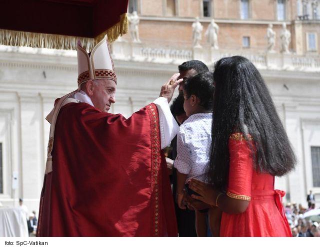 Duch Svätý však spája vzdialených, zjednocuje tých, čo sú ďaleko, dáva dohromady roztratených. Spája rozdielne odtiene do jednej harmónie, lebo vidí predovšetkým dobro; pozerá v prvom rade na človeka, nie na jeho chyby; hľadí na osobu, prv než na jej konanie. Duch Svätý stvárňuje Cirkev, stvárňuje svet ako miesta pre synov a dcéry, bratov a sestry. Synovia a dcéry, bratia a sestry: sú to podstatné mená, ktoré stoja pred akýmkoľvek iným prídavným menom.
