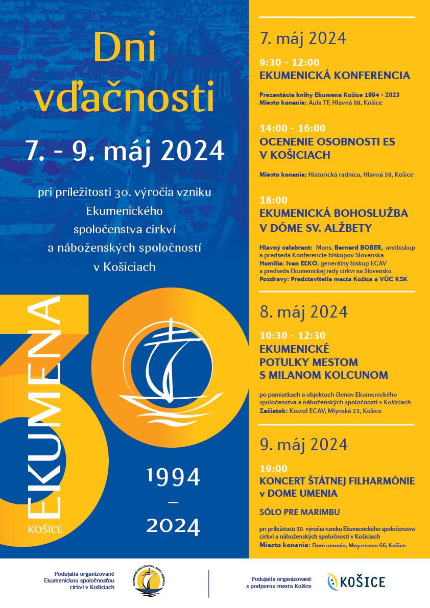 O deň neskôr, 8. mája sa uskutočnia ekumenický ladené potulky po sakálnych miestach v centre mesta Košice s historickým výkladom Milana Kolcúna. Začiatok je pri kostole ECAV na Mlynskej ulici 23 v Košiciach a záver v Katedrále sv. Alžbety na Hlavnom námestí 3. Posledný deň vďačnosti 9. mája 2024 bude koncert Ekumenického spoločenstva v Košiciach Sólo pre marimbu, ktorý pripravuje Štátna filharmónia v Dome umenia v Košiciach.