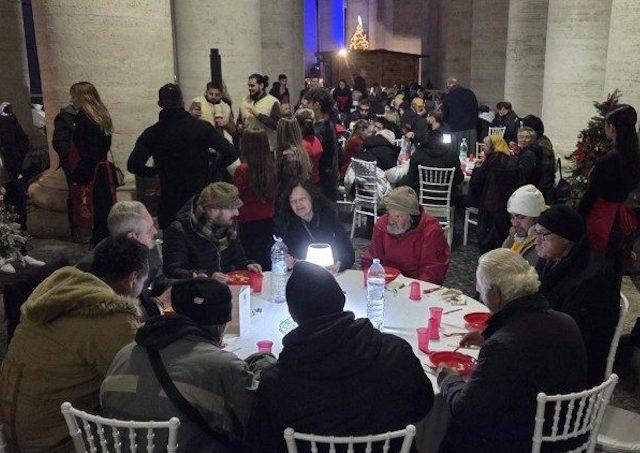 Predjedlo, cestoviny s lososom, ryba so zemiakmi a panettone. Vianočné menu, bolo možné vďaka štedrosti mnohých dobrovoľníkov zo štvrte Prati pri bazilike a vďaka zapojeniu reštaurátorov, malých obchodov i lekárnikov. Večer spríjemnili speváci, hudba mladých a Amedeo Minghi, ktorý zaspieval „La vita mia“, jeden zo svojich najväčších hitov. Tancovalo sa aj vďaka skupine tanečníkov z programu „Ballando con le stelle“. Bola to oslava priateľstva a bratstva pod Kolonádou, „ktorá,“ vysvetľuje kardinál Krajewski, „ako Kristove ramená pozýva prísť a je znamením, že títo naši bratia sú súčasťou Cirkvi.“