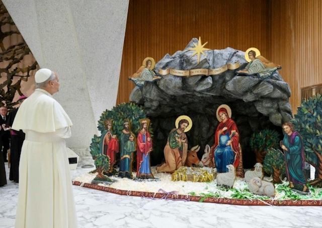 „Scéna narodenia bude pútnikom z celého sveta, ktorí prídu na Námestie svätého Petra, pripomínať, že Boh sa stáva blízkym ľudstvu, stáva sa jedným z nás a vstupuje do našich dejín v maličkosti dieťaťa. V chudobe betlehemskej maštale kontemplujeme tajomstvo pokory a lásky. Pred každým betlehemom, aj tým, ktorý si zhotovujeme v našich domovoch, znovu prežívame túto udalosť a znovu objavujeme potrebu hľadať v našom živote chvíle ticha a modlitby, aby sme našli samých seba a vstúpili do spoločenstva s Bohom.“