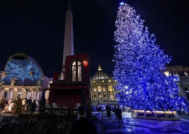 Vatikán 16. decembra (TK KBS) Na Námestí sv. Petra vo Vatikáne v pondelok 15. decembra slávnostne rozsvietili tradičný vianočný stromček a predstavili betlehem. Slávnosti predsedala sestra Raffaella Petrini, FSE, ktorá stojí na čele Governatorátu Mestského štátu Vatikán, za účasti cirkevných i civilných predstaviteľov diecéz, ktoré tento rok vianočné symboly darovali.