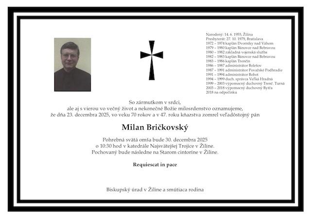 Žilina 25. decembra (TK KBS) V pondelok 23. decembra 2025 zomrel vo veku 70 rokov a v 47. roku kňazstva kňaz Žilinskej diecézy Milan Bričkovský. Pohrebná svätá omša bude v utorok 30. decembra 2025 o 10:30 v Katedrále Najsvätejšej Trojice v Žiline. Po jej skončení bude zosnulý pochovaný na Starom cintoríne v Žiline.