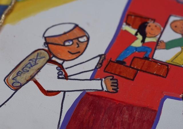 Obrázok zobrazuje pápeža Leva v okuliaroch s batohom na chrbte, na ktorom je nápis Vangelo (Evanjelium), ako sa chystá na cestu spolu s deťmi. Na kresbe je vidieť, ako deti ukladajú stavebné kocky, čo ich vykresľuje ako „budovateľov pokoja“. Ide o dojímavý odkaz, ktorým chceli mladí pacienti vyjadriť podporu Svätému Otcovi na začiatku jeho cesty do Alžírska, Kamerunu, Angoly a Rovníkovej Guiney.