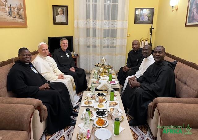 Stretnutie sa nieslo v znamení bratskej jednoduchosti a jednoty, vystihnutej biblickým citátom: „Aké dobré a milé je to, keď bratia žijú pospolu.“ Pápež, ktorý sám z tohto rádu vzišiel, prišiel medzi svojich spolubratov ako „brat medzi bratov“. Historický moment podčiarkla prítomnosť generálneho priora rehole P. Josepha Farrella, OSA, asistenta generála P. Martina Davakana, OSA, a tiež P. Augustina Ugbomaha, ktorý slúži v pápežskej sakristii. Súčasťou návštevy bolo spoločné bratské zhromaždenie a súkromný rozhovor, po ktorom nasledoval spoločný obed.