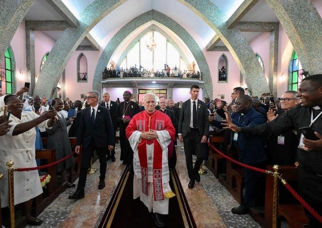 Veľmi sa teším zo stretnutia s vami. Ďakujem za vaše prijatie! Predovšetkým chcem vyjadriť svoju vďačnosť všetkým, ktorí slúžili a slúžia evanjeliu v Angole: ďakujem za evanjelizačnú prácu vykonanú v tejto krajine; za nádej Krista zasiatu do sŕdc ľudu; za lásku voči najchudobnejším. Ďakujem, že s vytrvalosťou pokračujete v budovaní pokroku tejto krajiny na pevných základoch zmierenia a pokoja. Osobitne pozdravujem svojich bratov biskupov, ktorí predsedajú ohlasovaniu viery a službe lásky. Ďakujem arcibiskupovi José Manuelovi zo Saurima za slová, ktoré mi adresoval v mene biskupskej konferencie.